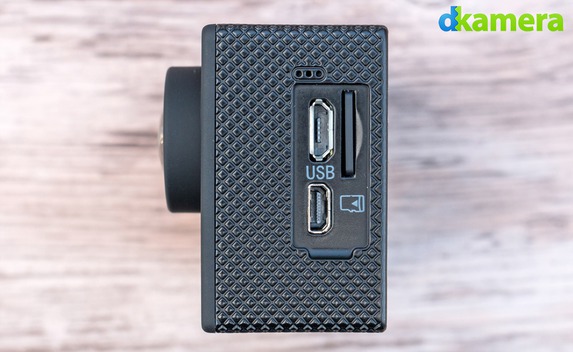 Über die linke Kameraseite lässt sich die Speicherkarte einstecken, zudem befinden sich hier der Micro-USB- und der Micro-HDMI-Port sowie das Mikrofon. Auf der Unterseite befindet sich hinter einer kleinen Klappe der Akku.
