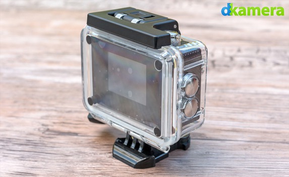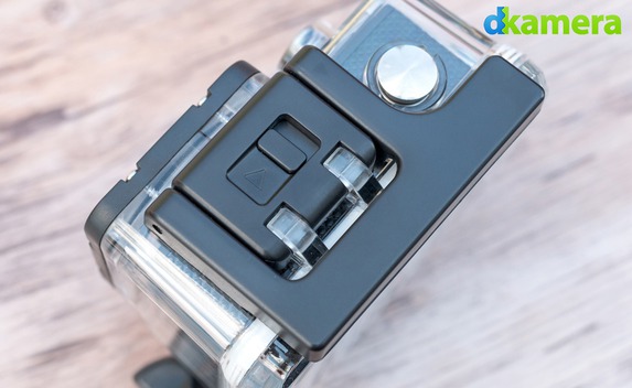 Das Schutzgehäuse ist aus durchsichtigem Kunststoff gefertigt und verfügt über vier große Tasten. Damit lassen sich die Tasten der Kamera gut bedienen. Geöffnet wird es – wie von den GoPro Gehäuse bekannt – durch ein Drücken des Schalters und dem gleichzeitigen Ziehen des Verschlusses nach oben. Dieser Verschluss sollte das Gehäuse in der Praxis sicher verschließen.