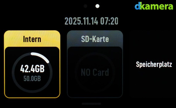 Für die Stromversorgung nutzt DJI das 1.950mAh starke Li-Ionen-Modell der Vorgängerkameras, das Aufladen ist via USB-C unter anderem direkt in der Kamera möglich. DJI nennt als Aufnahmezeit bis zu 240 Minuten (bei 1080p24). Zur Datenspeicherung steht der integrierte Speicher mit einer Kapazität von 50GB zur Verfügung, microSD-Karten lassen sich bei Bedarf ebenso einsetzen. Diese sollten die Standards der V30-Klasse erfüllen und können bis zu 1TB groß sein.