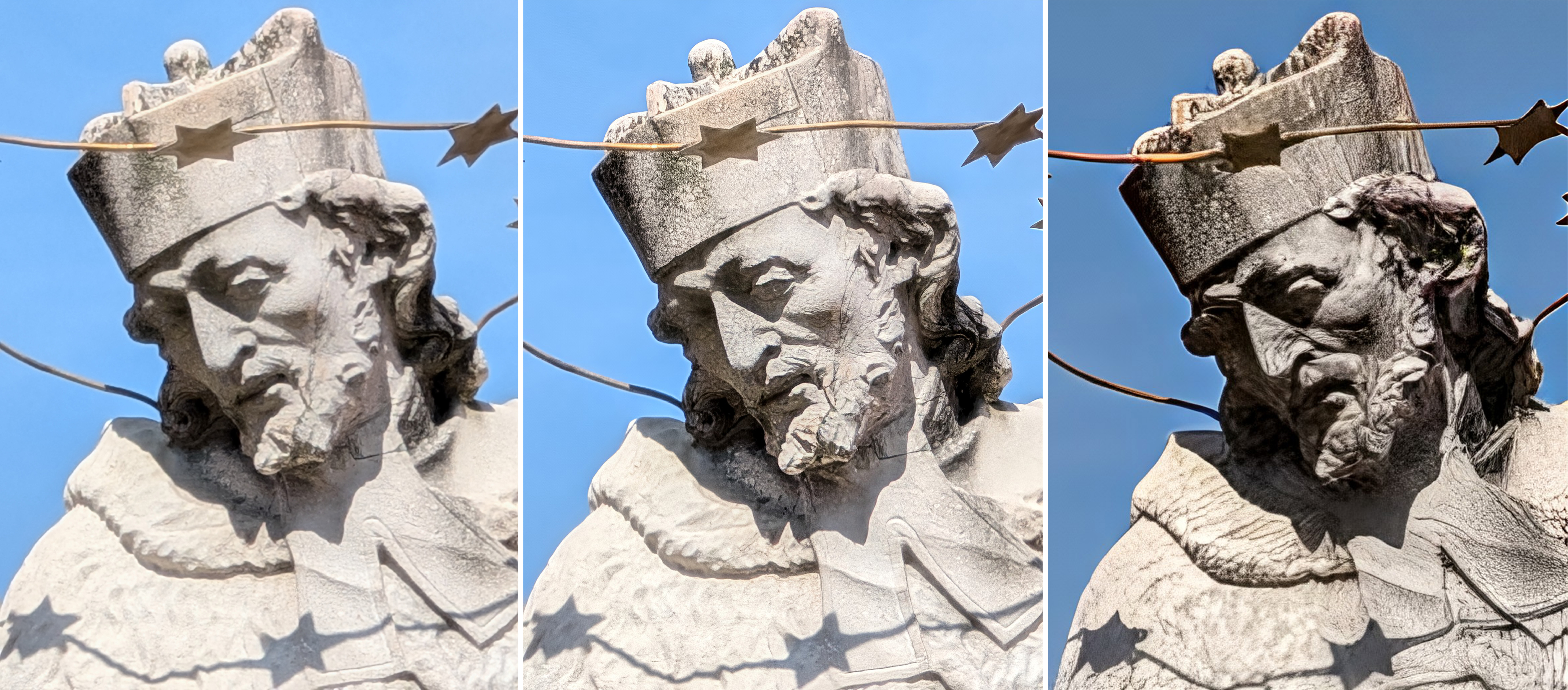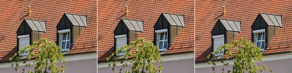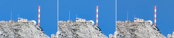 Beim dritten Motiv (alle Aufnahmen mit 12 Megapixel) kam ebenso die Telekamera zum Einsatz. Bei diesem Test vergleichen wir eine digital gezoomte Aufnahme mit einer Aufnahme, die digital gezoomt sowie nachträglich optimiert wurde und einer Aufnahme ohne Digitalzoom, die optimiert wurde. Bei den Bildern fällt sofort auf, dass die nur per Zoom-Optimierung bearbeitete Aufnahme (rechtes Bild) wesentlich schlechter ist. Dies ist auf die Tatsache zurückzuführen, dass die hohe Auflösung der Sensoren des Pixel 8 Pro (in diesem Fall des Sensors der Telekamera) beim digitalen Zoomprozess für deutliche Vorteile sorgt. Bei der Aufnahme ohne Digitalzoom fehlt effektiv ein Teil der Bilddaten, darauf kann nach der Aufnahme nicht mehr zugegriffen werden.