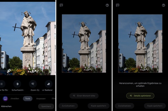 Erreicht wird die Zoom-Optimierung in der Google Fotos-App im „Tools“-Reiter. Hier befindet sie sich zwischen den bekannten Funktionen „Scharfzeichnen“ und „Magischer Radierer“. Aktuell kann man leider nur Bilder mit 12 Megapixel optimieren, bei 50 Megapixel bekommt man die Funktion nicht zu Gesicht. Durch einen Klick auf den entsprechenden Button wird das Bild geladen (Dauer rund drei Sekunden bei unserem Pixel 8 Pro), danach kann man auf Details optimieren klicken. Dieser Vorgang nahm bei uns etwa zehn Sekunden in Anspruch. Optionen werden leider keine angeboten.