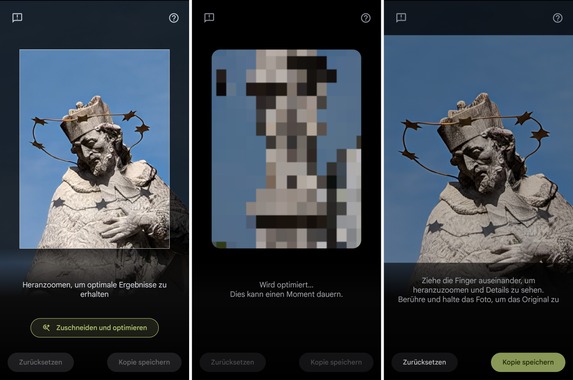 Die Bildkontrolle ist immerhin per Zoom möglich und das längere Tippen auf das Bild ermöglicht den Vorher-Nachher-Vergleich. Darüber hinaus kann den Bildausschnitt bestimmen und das Ergebnis dadurch potentiell noch beeinflussen. Das gleicht aber trotzdem mehr der „Trial and Error“-Methode als einer zielgerichteten Optimierung.
