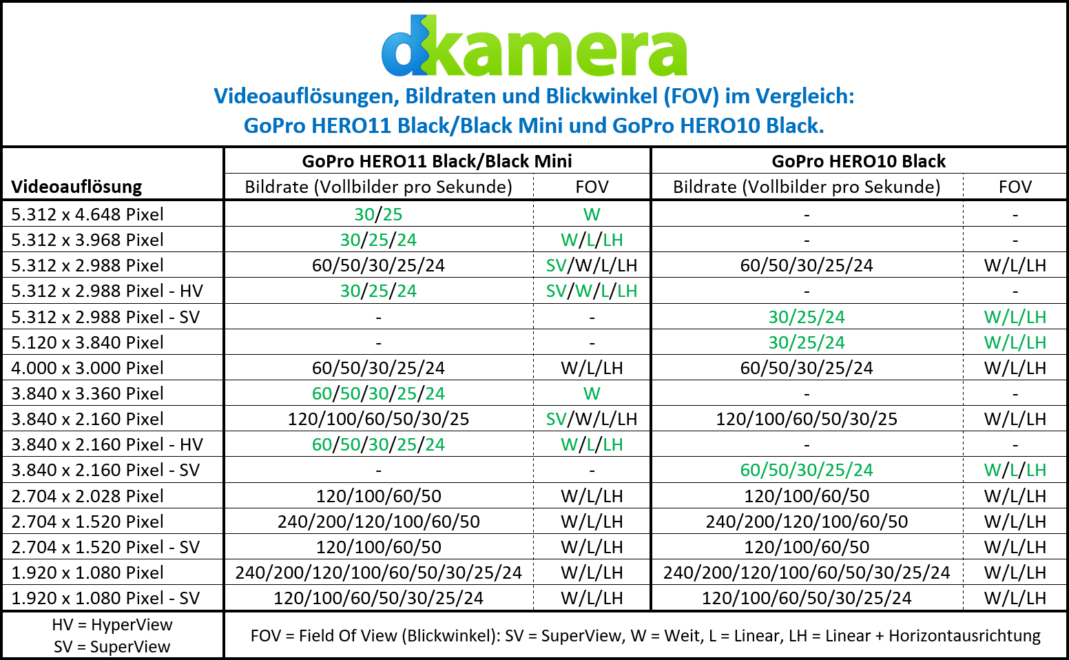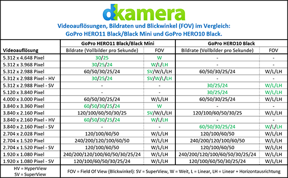 Videos nimmt die GoPro HERO11 Black Mini mit diversen Bildraten und Auflösungen auf, zur GoPro HERO11 Black gibt es dabei keinen Unterschied. Bei der höchsten Auflösung, „5,3K“ genannt, kann man sich für 5.312 x 4.648 Pixel (8:7), 5.312 x 3.968 Pixel (4:3) oder 5.312 x 2.988 Pixel (16:9) entscheiden. 60 Vollbilder pro Sekunde sind im 16:9-Format und 30 Vollbilder pro Sekunde im 4:3- sowie 8:7-Format wählbar. Daneben erlaubt die Actionkamera das Speichern von 4K-Videos mit 3.840 x 2.160 Pixel (16:9) oder 4.000 x 3.000 Pixel (4:3). Bis zu 120 Vollbilder pro Sekunde lassen sich in 4K-Auflösung im 16:9- und bis zu 60 Vollbilder pro Sekunde im 4:3-Format einstellen. Wer noch höhere Bildraten benötigt, muss sich für eine geringe Auflösung entscheiden. Bis zu 240 Vollbilder pro Sekunde sind sowohl bei 2,7K-Videos mit 2.704 x 1.520 Pixel als auch Full-HD-Videos mit 1.920 x 1.080 Pixel einstellbar. Zusätzlich kann man sich bei 2.704 x 2.208 Pixel (4:3) für bis zu 120 Vollbilder pro Sekunde) entscheiden. Wer die bestmögliche Qualität erhalten möchte, kann die 10-Bit-Aufnahme aktivieren und mit bis zu 60 Vollbildern pro Sekunde in 5,3K (bei 8:7 nur 30p) oder 4K-Auflösung filmen.