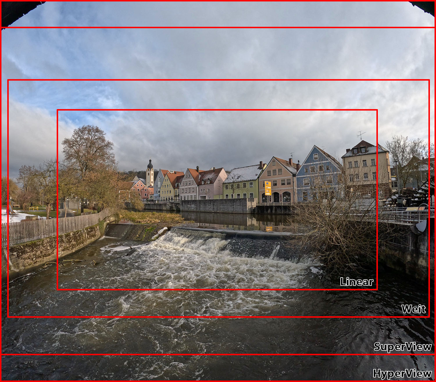 Die Actionkameras von GoPro sind aber nicht nur für ihre zahlreichen Auflösungen und Bildraten bekannt, es lassen sich auch noch diverse andere Parameter einstellen. Dazu gehört der Bildwinkel, die Option wird auch „FOV“ genannt. Die weitwinkeligste Bildwinkel-Option (FOV) wurde mit der GoPro HERO11 Black und der Black Mini eingeführt und ist die HyperView-Option. Diese lässt sich bei 16:9-Aufnahmen einstellen, wenn in „5,3K“-Auflösung maximal 30 und „4K“-Auflösung maximal 60 Vollbilder pro Sekunde gewählt wurden. Bei der HyperView-Option nutzt die Actionkamera die kompletten Sensordaten und staucht diese auf ein 16:9-Bild zusammen. Das sorgt effektiv für den größten Bildwinkel, aber auch sichtbare Verzerrungen am Bildrand. Daneben steht die von früheren Modellen bekannte SuperView-Option zur Verfügung. Anders als bei der HyperView-Option nutzt die Kamera hier nicht die Bilddaten des kompletten Sensors, sondern von einem Ausschnitt im 4:3-Format. Da diese wieder auf das 16:9-Format zusammengestaucht werden, sind ebenso deutliche Verzerrungen zu sehen.