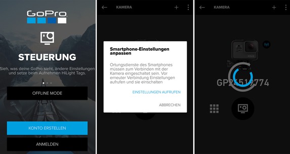 Die HERO5 Black kann man nicht nur über die Tasten bzw. per Touch oder Sprache steuern, das funktioniert auch mittels WLAN bzw. Bluetooth und der Capture-App von GoPro. Diese ist für Android sowie iOS erhältlich und verlangt der in der neuesten Version das Erstellen eines Kontos und eine Anmeldung. Umgehen lässt sich dieser Schritt nur durch das Aktivieren des Flugzeugmodus. Das ist wenig benutzerfreundlich und aus unserer Sicht ein echtes Ärgernis. Hat man sich fürs Nutzen des Offline-Modus entschieden, verlangt die App zusätzlich das Aktivieren der Positionsbestimmung (= GPS am Smartphone aktivieren). Auch das gefällt uns nicht. Der Benutzer sollte selbst entscheiden können, welche Einstellungen er vornimmt.