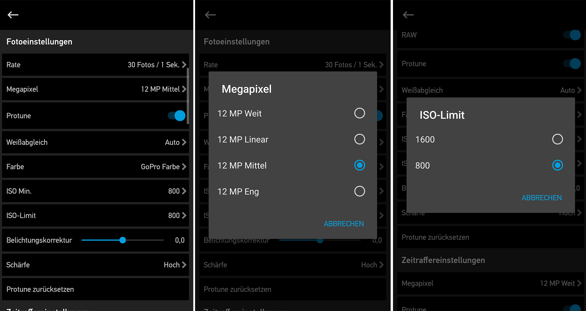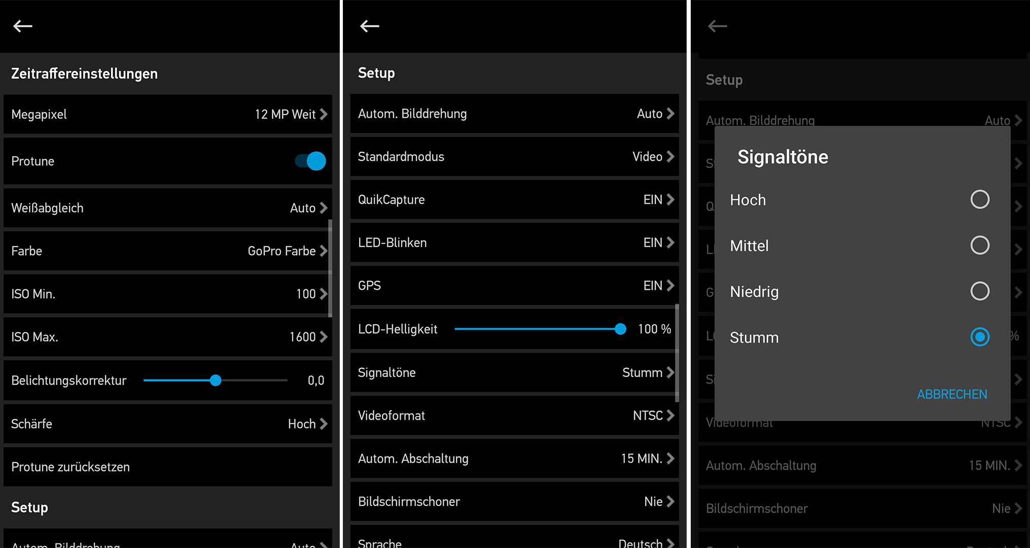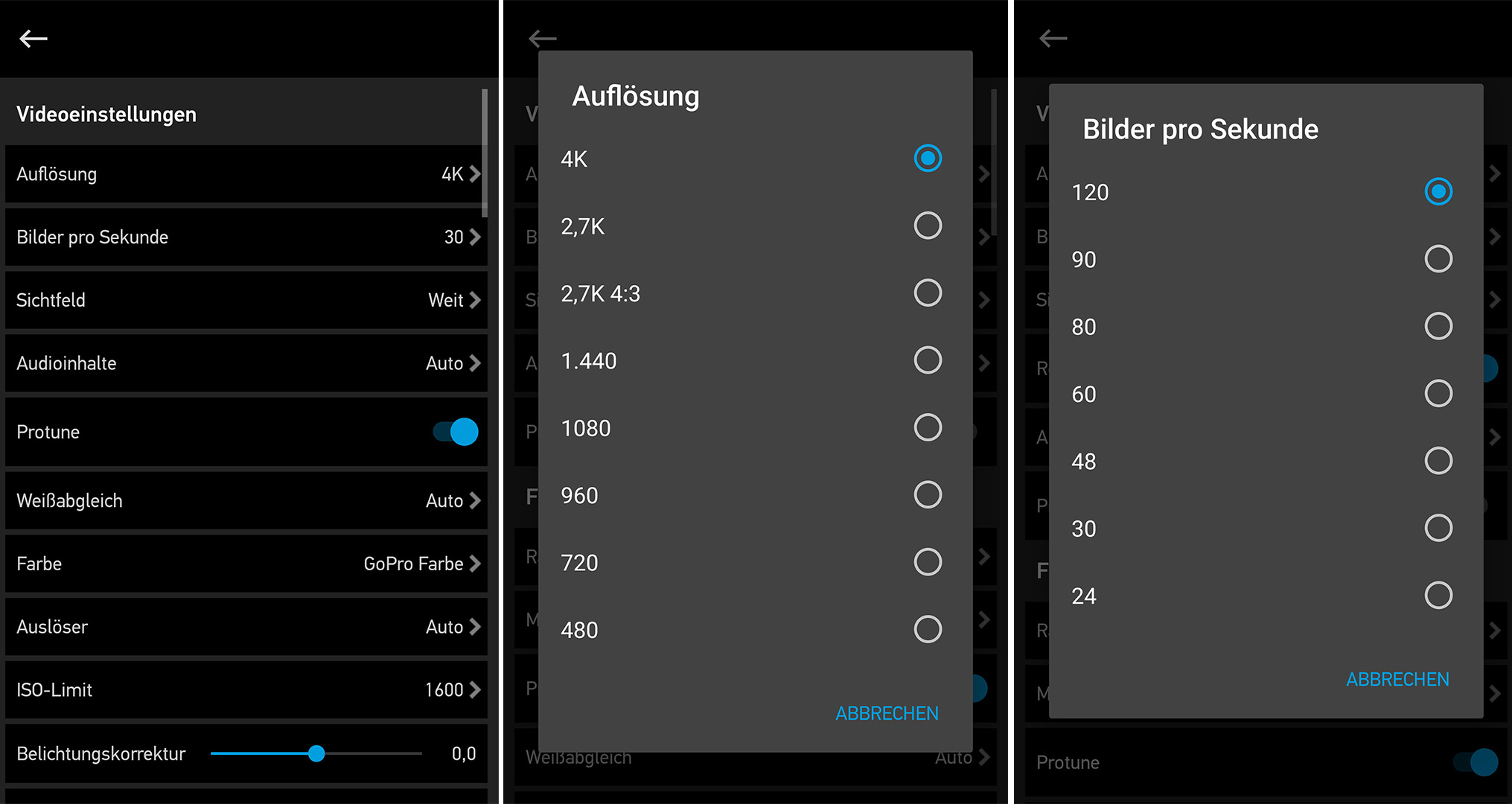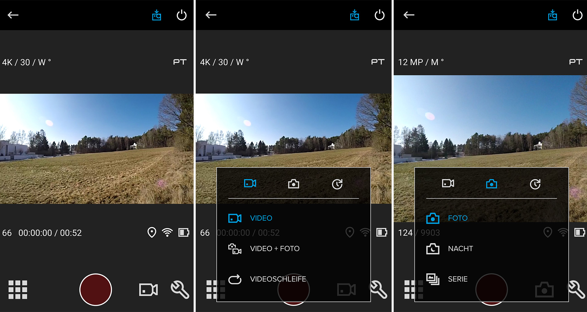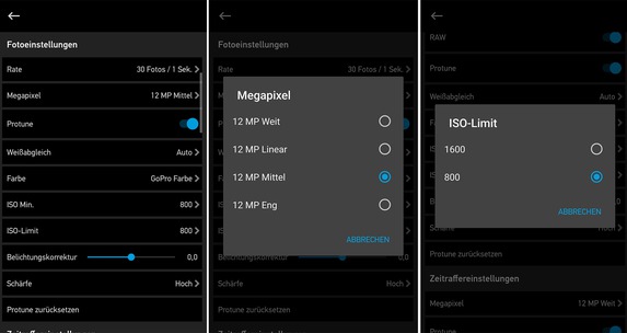 Per Touch kann man zwischen den einzelnen Aufnahmemodi wechseln, die Auflösung und Bildrate einstellen oder andere Einstellungen vornehmen. Das Wischen nach unten öffnet die Systemeinstellungen sowie die Drahtlos-Optionen, das Wischen nach rechts erlaubt den Zugriff auf den Wiedergabemodus. Wer nach links wischt, erreicht den ProTune-Modus, und durch das längere Gedrückthalten kann man die Belichtung konfigurieren. Die Bedienung funktioniert dadurch deutlich schneller und intuitiver als bei der HERO4 Black, die nur über das frontseitige Monochrom-LCD verfügt.