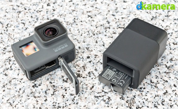 Wer den Akku der HERO6 Black aufladen möchte, während die Kamera im Einsatz ist, kann das Dualladegerät erwerben. Dieses wird per USB (Typ C) mit Strom versorgt und lädt, wie der Name bereits verrät, zwei Akkus gleichzeitig auf.