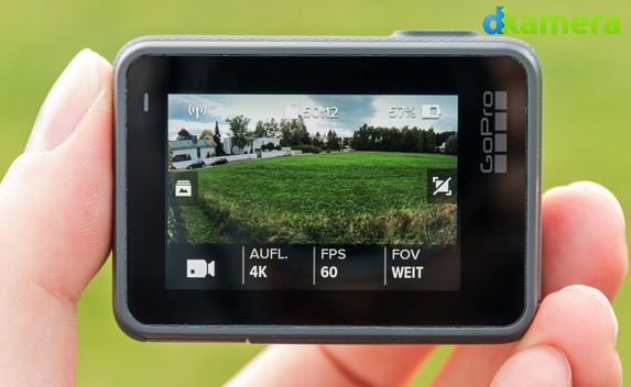 Das zweite Display der HERO6 Black liegt auf der Vorderseite und zeigt die wichtigsten Aufnahmeinformationen an. Es handelt sich um ein monochromes LCD, die Wiedergabe oder Aufnahmekontrolle wird darüber nicht ermöglicht.