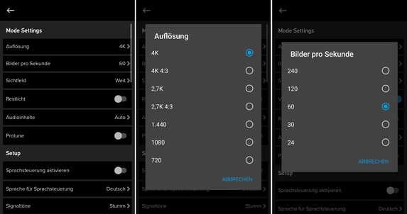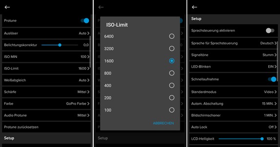 Die GoPro-App hat neben der Liveansicht viele Einstellungsmöglichkeiten zu bieten: