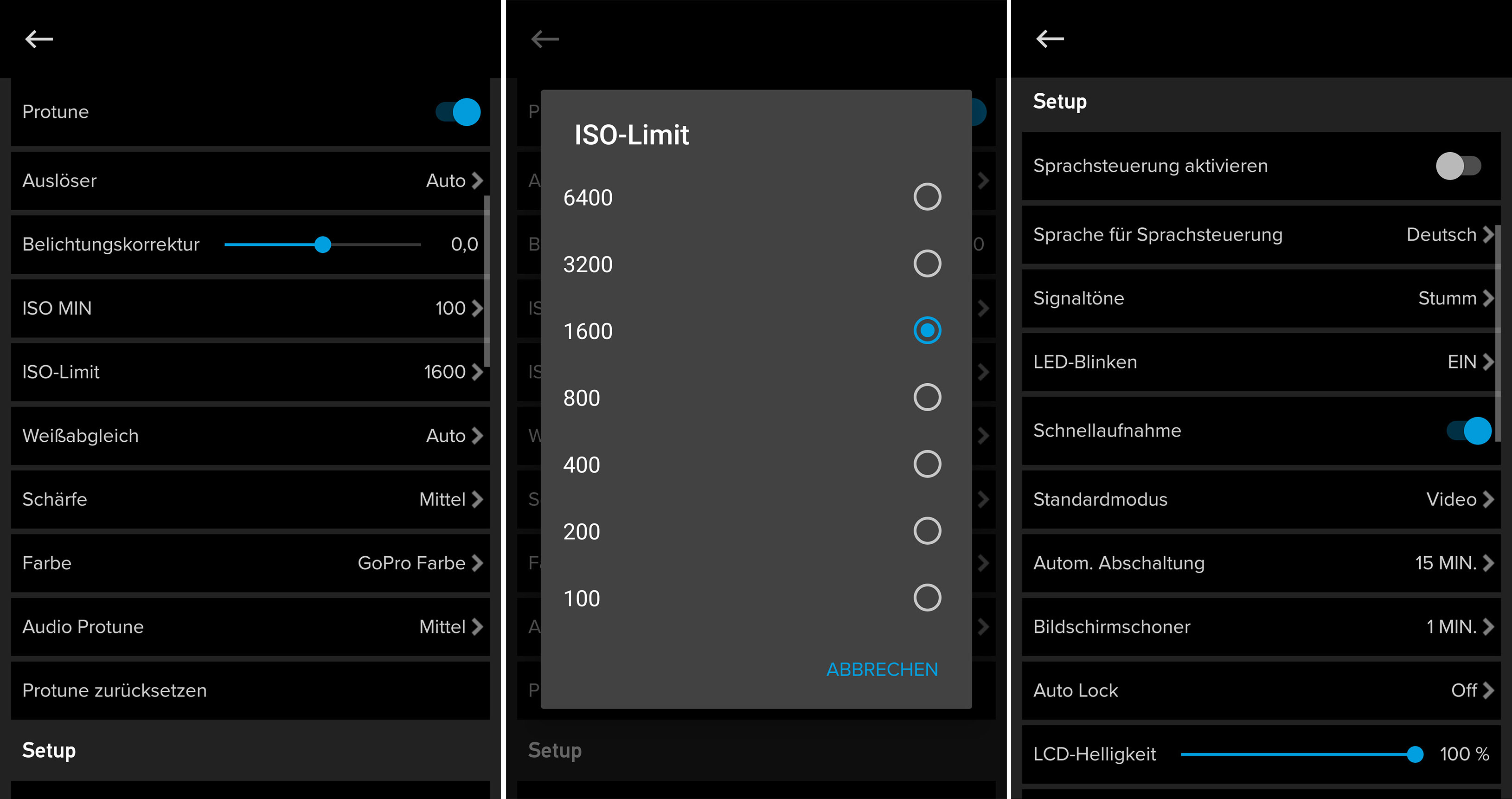 Zu den ProTune-Optionen zählen unter anderem die Belichtungskorrektur und das ISO-Limit: