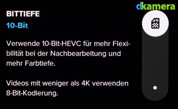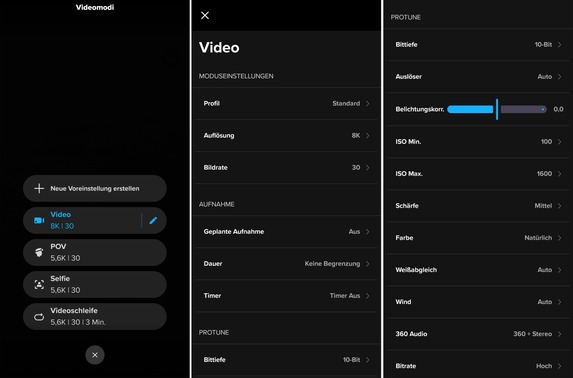 An Optionen hat GoPro bei der Max 2 nicht gespart, diverse Parameter lassen sich im Menü verändern. Dazu zählen natürlich die Auflösung und die Bildrate sowie auch der Bildstil, der maximale ISO-Wert oder die Nachschärfung. Letztere Parameter sind über die Pro-Tune-Optionen der Kamera zu erreichen. Konfigurieren kann man darüber zudem den Ton.