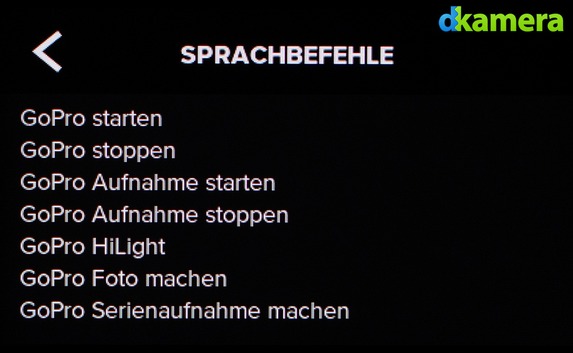 Ist die Kamera gerade einmal nicht in Reichweite des Nutzers, lassen sich Eingaben auf unterschiedlichen Wegen vornehmen. Dazu gehört die Sprachsteuerung. Angeboten werden dabei unter anderem die Befehle „GoPro Foto machen“, „GoPro starten“, „GoPro Zeitraffer starten“, „GoPro Video-Modus“, „GoPro Foto-Modus“ und „GoPro ausschalten“.