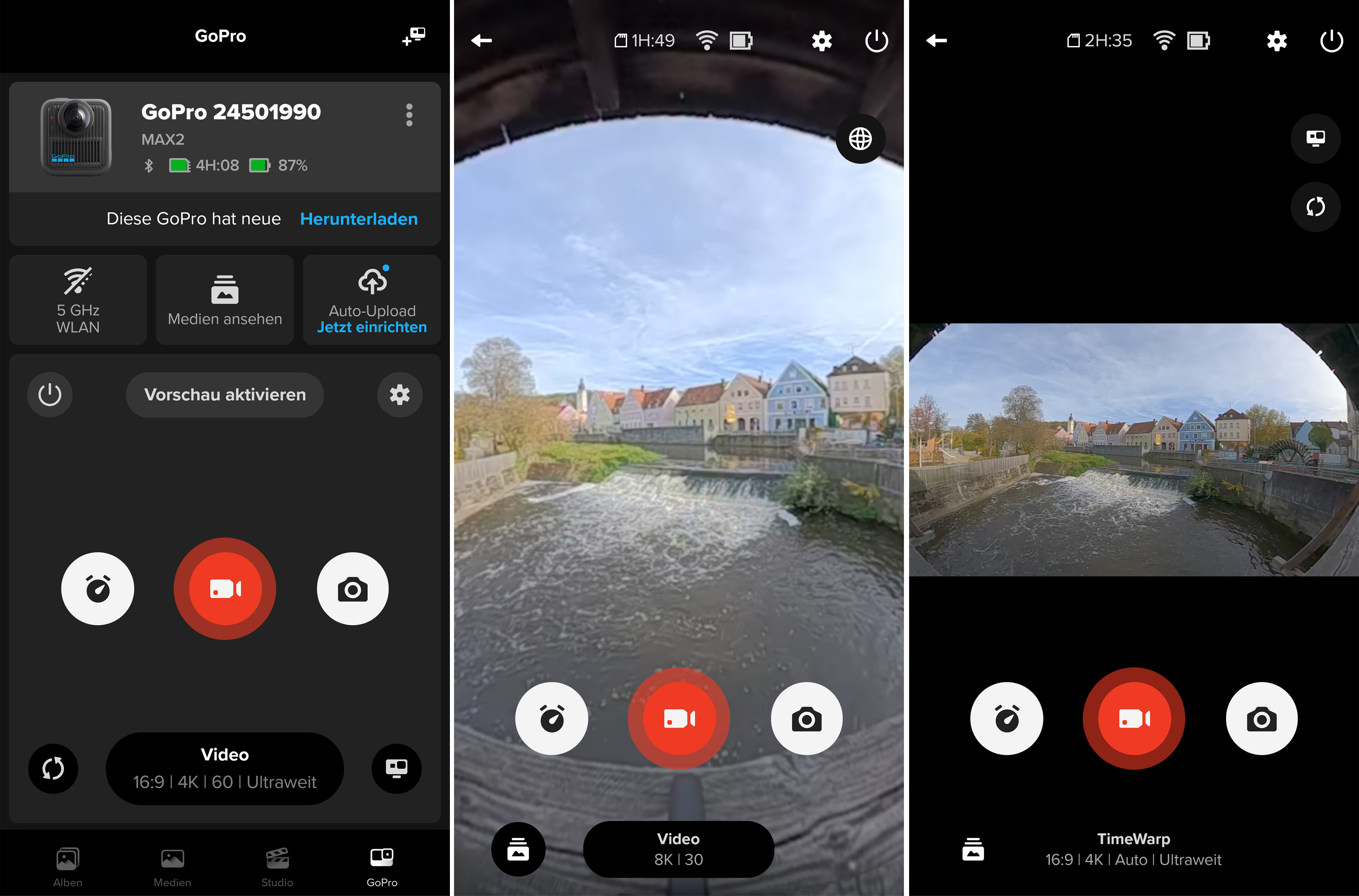 Dreh- und Angelpunkt für umfangreichere Eingaben sowie für die Nachbearbeitung ist bei der GoPro Max 2 die Quik-App. Diese App nutzt GoPro bei allen Actionkameras, weshalb sich Nutzer nicht umgewöhnen müssen. Die Quik-App erlaubt die Bildkontrolle vor, während und nach der Aufnahme sowie das Verändern aller relevanter Aufnahmeparameter.