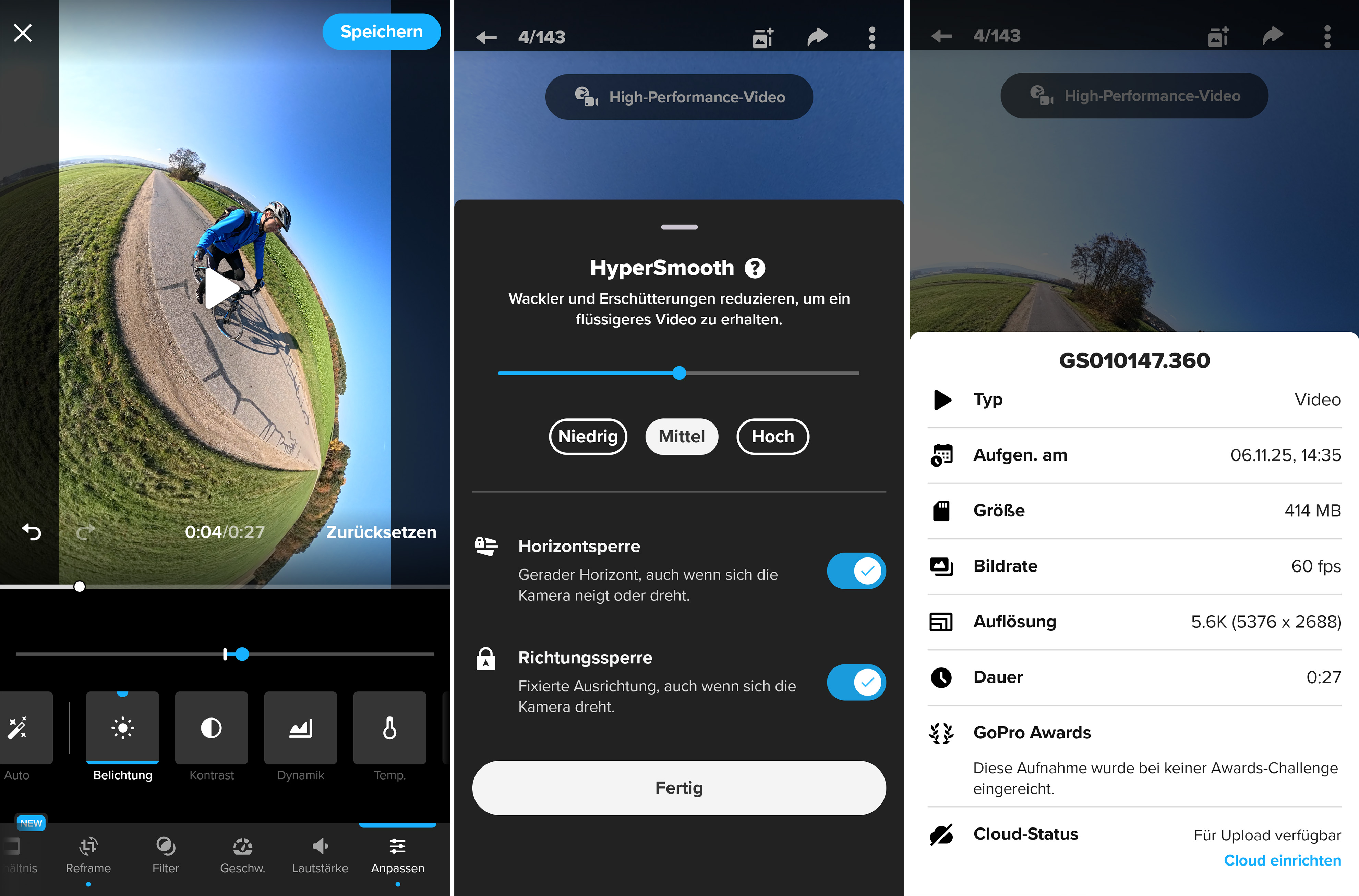Für viele Nutzer mag der Funktionsumfang der App ausreichend sein, eine Desktop-Software bietet jedoch spätestens bei größeren Projekten deutlich mehr Komfort. Zudem kann man via App leider keine 8K-Videos exportieren. Auf dem Desktop steht nur der GoPro-Player mit einem geringeren Funktionsumfang zur Verfügung, dieser ist kein echter Ersatz für die App. 8K-Exporte sind damit aber immerhin möglich. Die Bitrate der Aufnahmen fällt beim Export mit dem GoPro-Player zudem generell höher als beim Export via App aus.