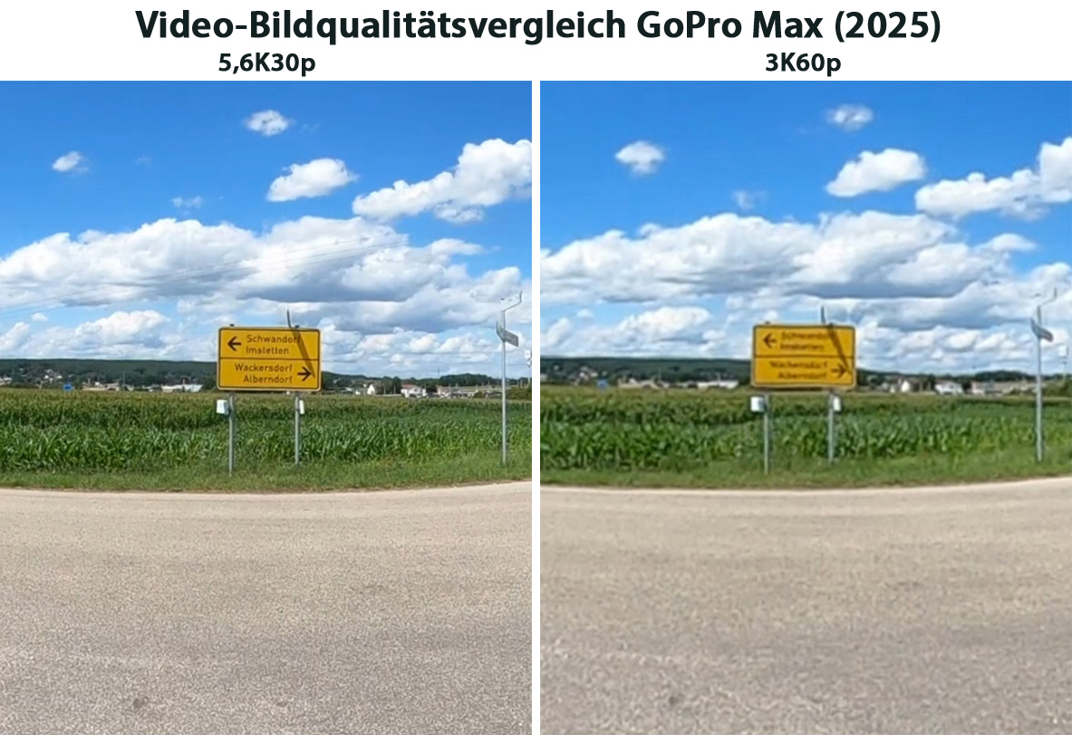 Wer möglichst viele Details aufnehmen will, sollte sich in jedem Fall für die maximale Auflösung entscheiden. Die rund dreimal mehr Pixel besitzenden 5,6K-Videos überzeugen mit einer weit besseren Bildqualität, bei den 3K-Aufnahmen mit nicht einmal fünf Megapixel bekommt man fast keine Details zu Gesicht. Das sollte auch keinen verwundern, rund fünf Megapixel sind für 360-Grad-Aufnahmen viel zu wenig. Leider ist die 3K-Einstellung bei der GoPro Max (2025) für Einsätze mit mehr als 30 Vollbildern pro Sekunde notwendig, schnelle Motive kann man daher nur mit der 3K-Option flüssig einfangen. In der Praxis würden wir allerdings eindeutig eher einen Kompromiss bei der Bildrate als bei der Auflösung eingehen. Das gilt vor allem auch für Nutzer, die die Aufnahmen für klassische Videos verwenden möchten und hierzu nachträglich den Bildausschnitt festlegen. Hier bleibt selbst bei der 5,6K-Auflösung effektiv nur etwa Full-HD übrig. Bei 3K fällt man auf SD-Qualität zurück. Dies ist für Einsätze im Jahr 2025 viel zu wenig.