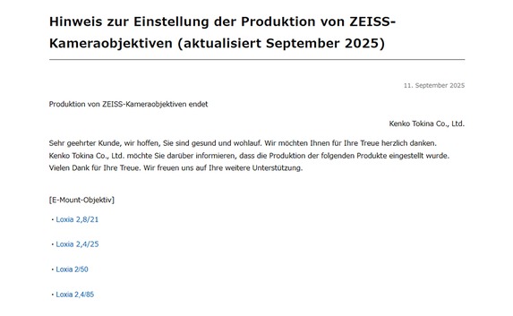 Betroffen sind auf jeden Fall die Modelle Zeiss Loxia 21mm F2,8, Loxia 25mm F2,4, Loxia 50mm F2 und Loxia 85mm F2,4, das Loxia 35mm F2 ist hingegen nicht aufgeführt. Die genannten Loxia-Objektive lassen sich teilweise noch im Handel erstehen, viele Händler mit lagernden Exemplaren gibt es jedoch nicht mehr. Demnächst dürften die Objektive dann komplett vom Markt verschwinden, denn Zeiss wird die Produktion auch an kein anderes Unternehmen übergeben.
