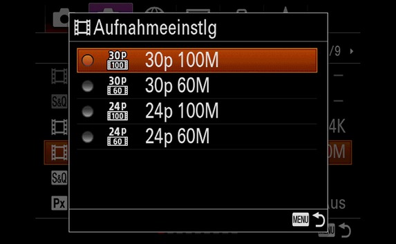 Bei einigen Kameras lässt sich die Video-Bitrate wählen (hier 60MBit/s oder 100MBit/s):