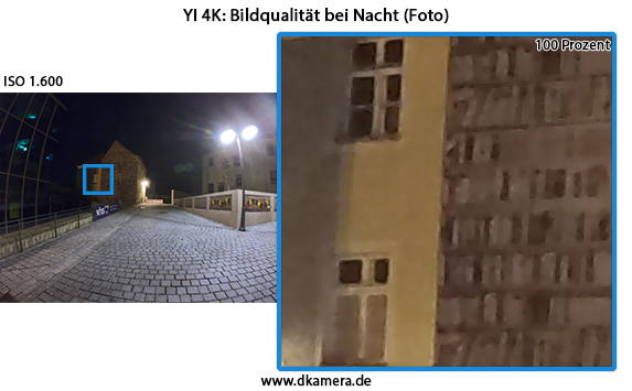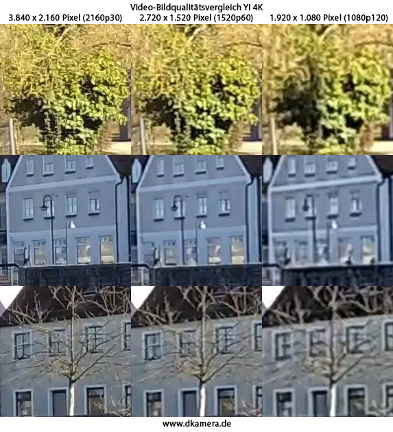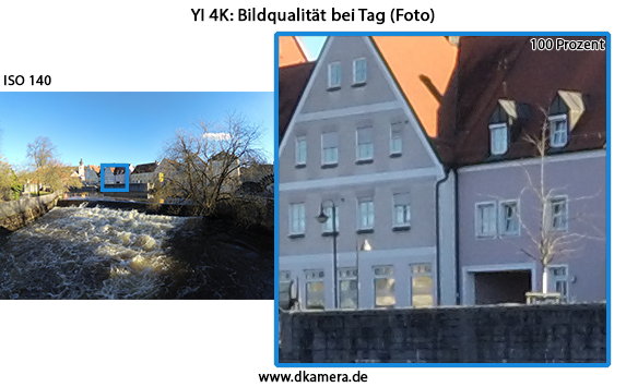 Bei Videos stellt natürlich die 4K-Auflösung die beste Wahl dar, wenn die Aufnahmen besonders viele Details zeigen sollen. Die YI 4K überzeugt mit einer sehr guten bis exzellenten Detailwiedergabe, bei genauem Hinsehen wirken die Aufnahmen aber doch schon etwas überschärft. Wer schneller bewegte Motive festhalten möchte, sollte sich für 60 Vollbilder pro Sekunde entscheiden. Hier stellen 2.720 x 1.520 Pixel die höchste Auflösung dar. Details werden immer noch gut bis sehr gut wiedergegeben, bei feinen Strukturen ist der Unterschied jedoch deutlich sichtbar.