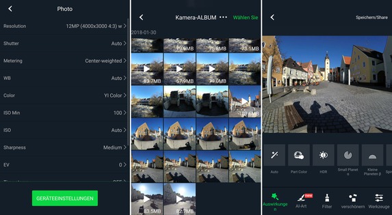 Bei den Aufnahme-Optionen stehen diverse Parameter zur Wahl: Zusätzlich zur Auflösung und Bildrate ist das Bildfeld, die Belichtungsmessung oder auch die Sensorempfindlichkeit wählbar. Zu den weiteren Einstellungsmöglichkeiten zählen die Schärfe, das Einblenden eines Zeitstempels und die Lautstärke der Kamerageräusche. Im Wiedergabemodus lassen sich mit der App nicht nur Bilder und Videos betrachten, erstere kann man auch bearbeiten und auf dem Mobilgerät abspeichern. Im Test ließ sich die App meistens sehr gut bedienen, ab und zu gab es jedoch auch kleinere Hänger.
