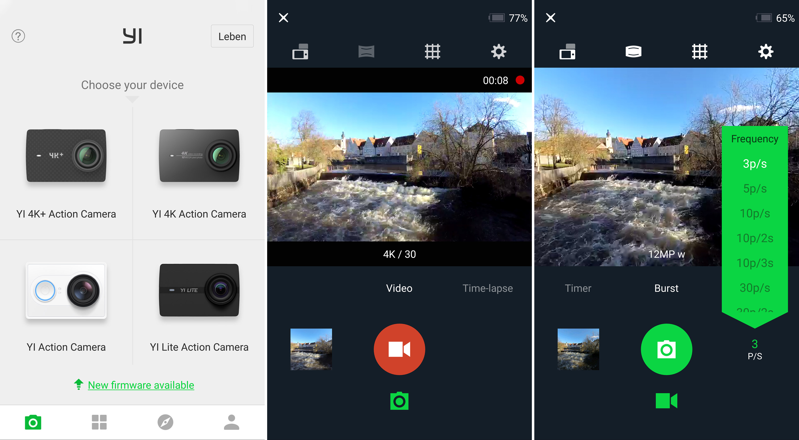 Alternativ zur Bedienung über das Display, lässt sich die YI 4K Action Camera natürlich auch drahtlos per WLAN und Bluetooth steuern. Dazu steht für Geräte mit Android und iOS die YI Action Kamera-App zur Verfügung. Diese hat wie alle Actionkamera-Apps eine Liveansicht sowie zahlreiche Optionen zu bieten. Über Touchbuttons lässt sich nicht nur zwischen den Foto- und Videomodi wechseln, es sind auch das Aufnehmen von Fotos und das Starten/Stoppen von Videos möglich. Zudem kann man die Ansicht drehen und ein Gitter einblenden.