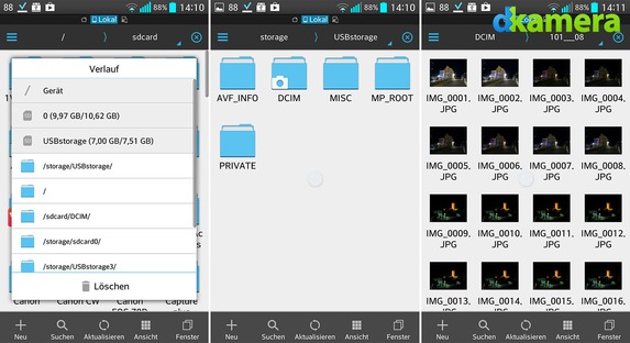 Wenn Ihre Kamera kein WLAN besitzt oder Sie auch RAW-Bilder übertragen möchten, können Sie Ihre Kamera auch direkt per USB mit dem Smartphone oder Tablet-PC verbinden (wenn dieses wie bereits erwähnt USB On-The-Go (OTG) unterstützt). Dadurch sind Sie in der Lage, die Bilder und Videos über einen Dateiexplorer zu kopieren. Wenn Ihr Smartphone/Tablet-PC nicht genügend integrierten Speicher besitzt, können Sie auch einen USB-Hub verwenden und neben der Kamera beispielsweise einen Stick am Smartphone oder Tablet-PC anschließen. Dafür ist allerdings eventuell auch wieder eine externe Stromversorgung nötig.