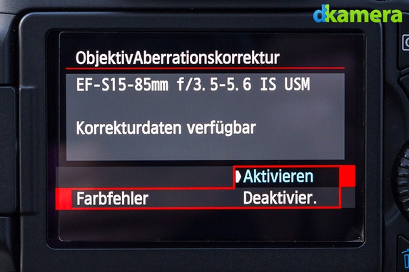 Das Objektivkorrekturmenü einer Canon EOS 70D: