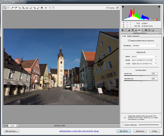 Die automatische Korrektur wird von der Kamera allerdings nur auf JPEG-Bilder angewendet. Wer im RAW-Format fotografiert, muss bei den Aufnahmen oftmals nachhelfen. Von Adobe Photoshop und Lightroom werden beispielsweise Objektivkorrekturprofile angeboten, die sich per Mausklick aktivieren lassen. Hiermit werden die Vignettierung, die Verzeichnung und ein Großteil der chromatischen Aberrationen korrigiert. Dies gilt ebenso für DxO Optics Pro. Wer möchte, kann allerdings auch selbst Hand anlegen und die Korrektur weiter verfeinern.