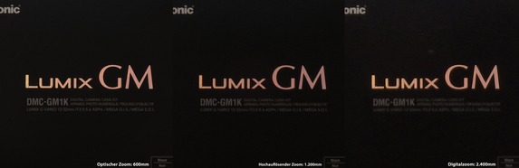 Unsere Kandidaten werden jeweils mit maximalem optischen Zoom, mit dem laut den Herstellern besonders hochwertigen Zoom und dem digitalen Zoom getestet. Motiv eins ist ein Ortsschild, das aus einer größeren Entfernung fotografiert wird. Motiv zwei ist die Verpackung einer Panasonic Lumix DMC-GM1 (Testbericht)