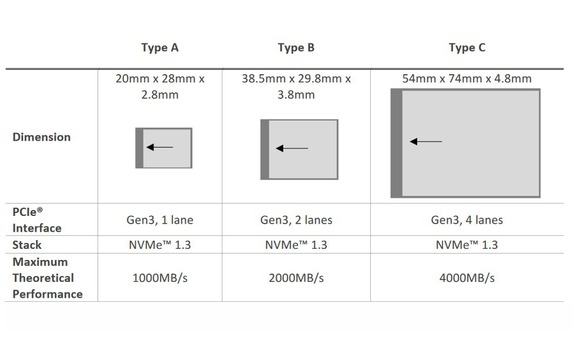 Die kleinen Typ A-Karten schaffen theoretisch bis zu 1GB/s, bei den Typ B-Karten sind es 2GB/s und bei den Typ C-Karten bis zu 4GB/s. Als Übertragungsschnittstelle wird PCIe (3.0 x2 bzw. 4.0 x2) genutzt, der Kartentyp bestimmt die Anbindung (Typ A: 1 Lane, Typ B: 2 Lanes, Typ C: 4 Lanes).