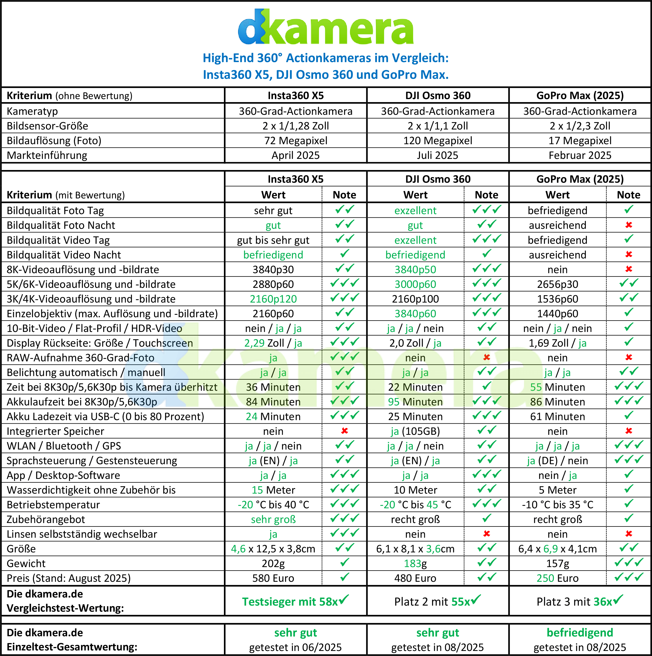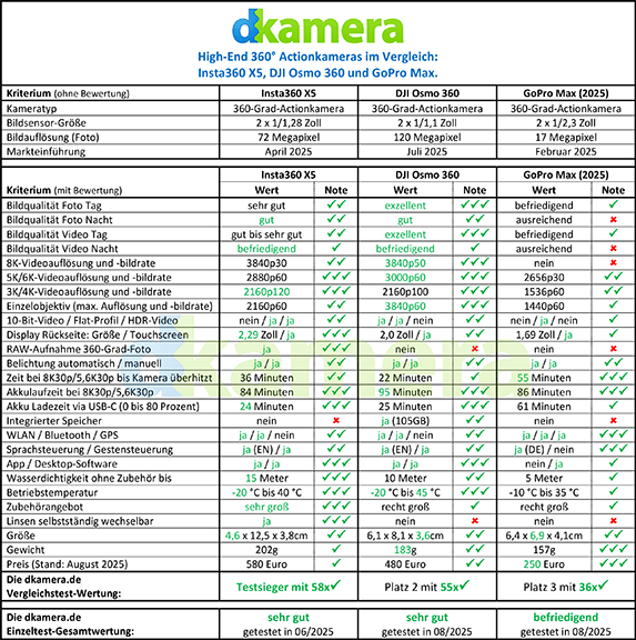 360-Grad-Kameras sind im Vergleich zu klassischen Kameras ganz besondere Modelle. Sie verfügen über zwei Objektive und können die komplette Szenerie aufnehmen. Das erlaubt besondere Aufnahmen, stellt an die Kameras aber auch sehr hohe Ansprüche. Wir vergleichen in diesem Test die 360-Grad-Kameras der bekanntesten Hersteller von Actionkameras: Insta360 schickt die X5 ins Rennen, DJI die Osmo 360 und GoPro die Max (2025).