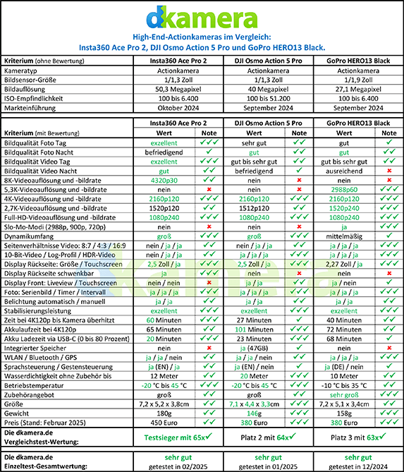 Nachdem wir bereits letztes Jahr die drei besten Actionkameras der drei bekanntesten Hersteller miteinander verglichen hatten, wollen wir die neuen Flaggschiffe auch dieses Jahr in einem großen Vergleichstest gegeneinander antreten lassen. Insta360 schickt die Ace Pro 2 ins Rennen, GoPro die HERO13 Black und DJI die Osmo Action 5 Pro.