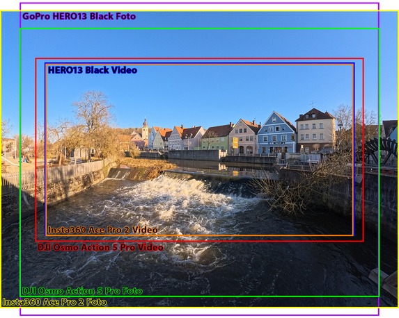 Bei der Insta360 Ace Pro 2 kann man sich zwischen „ActionView“, „UltraWide“, „Natürlicher Weitwinkel“ (= MEGA), „Dewarp“, „Linear" sowie 45 Grad Horizontsperre und 360 Grad Horizontsperre entscheiden, bei der HERO13 Black zwischen „HyperView“, „SuperView“, „Weit“, „Linear“ und „Linear + Horizontsperre“. Die Osmo Action 5 Pro hat die Optionen „Extra weit“, „weit“ und „Standard (Entzerrung) zu bieten. Bei den weitesten Sichtfeldern nutzen die Kameras bei Aufnahmen im 16:9-Format zusätzliche Sensorflächen und stauchen diese Bilddaten in das 16:9-Format. Dadurch können sich stärkere Verzerrungen ergeben. Wer möglichst natürliche Aufnahmen benötigt, sollte sich für die linearen und Standard-Sichtfelder mit geringen Verzerrungen entscheiden. Zoomen kann man jeweils bis zu zweifach digital, dies wird allerdings nicht bei den höchsten Auflösungen unterstützt. Die HERO13 Black bietet bei der maximalen Auflösung noch einen 1,4-fach-Zoom an.