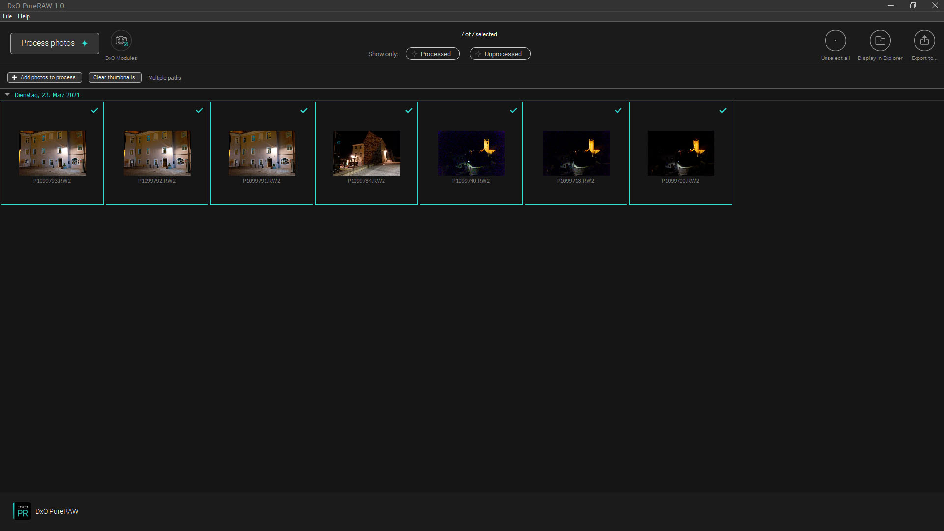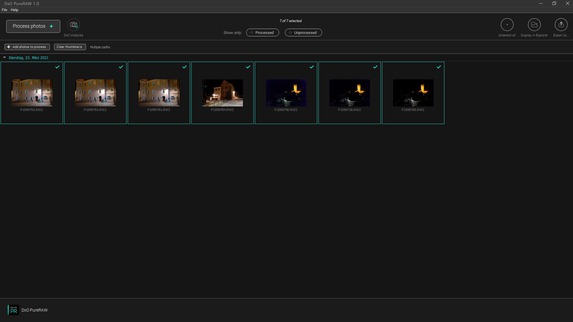 Die Dauer der Bearbeitung hängt natürlich von den Einstellungen, dem eigentlichen Bild und dem verwendeten Rechner ab. In unserem Test wurden etwa 30 Sekunden pro RAW einer Panasonic Lumix DC-S5 benötigt (Computer: AMD Ryzen 7 1700X, 32GB Ram und Nvidia Geforce GTX 970). Da neben dem Hauptrozessor des Rechners auch die Grafikkarte verwendet wird, sind deutliche Abweichungen möglich.