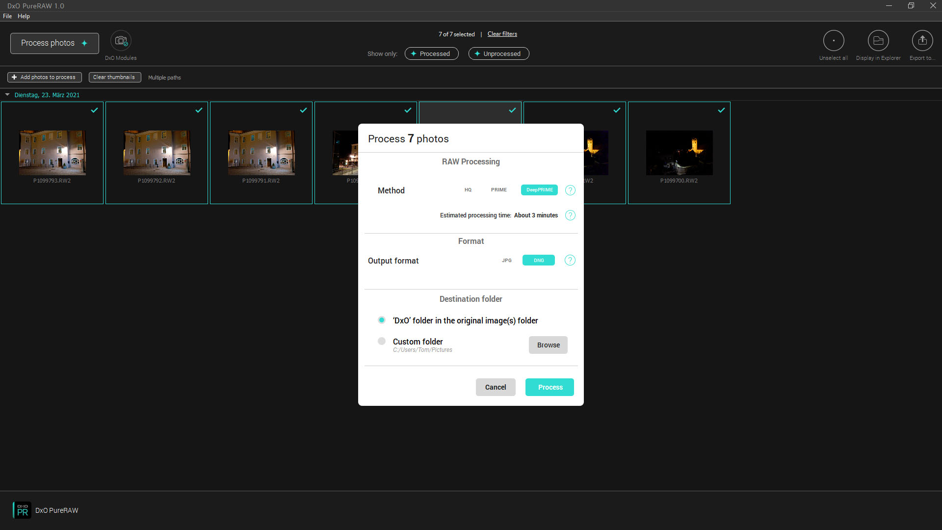 Die Arbeit mit DxO Pure RAW gestaltet sich denkbar einfach. Die zu verarbeitenden Bilder werden ausgewählt, die Ausführung der Rauschreduzierung bestimmt und der finale Ablageordner eingestellt. Anschließend bearbeitet DxO PureRAW alle Bilder mit den gewünschten Einstellungen. Der gesamte Prozess wurde laut den DxO Labs möglichst einfach gehalten, alle Optimierungen werden mit Ausnahme der Rauschreduzierungsmethode automatisch vorgenommen. Bei letzterer kann man sich wie bei DxO PhotoLab 4 für „HQ“, „DxO Prime“ oder „DxO DeepPrime“ entscheiden.