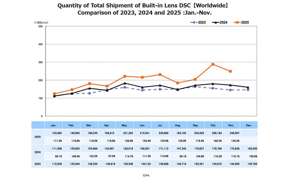 Doch seit 2025 zeichnet sich eine Trendwende ab. Kompakte Modelle sind wieder deutlich gefragter. Dies zeigen unter anderem die CIPA-Zahlen. In allen Monaten des Jahres 2025 (die Dezemberzahlen sind jedoch noch nicht inkludiert) wurden mehr „Built-in Lens DSC“ als in den Vorjahren ausgeliefert. Das Plus ist dabei nicht klein, sondern beachtlich. In den allermeisten Monaten fiel der Absatz um mindestens 15 Prozent höher aus, im November legten die Auslieferungen sogar um 60 Prozent. Die hier erreichten 288.000 Stück wurden zuletzt im Frühjahr 2021, also vor fünf Jahren, abgesetzt.