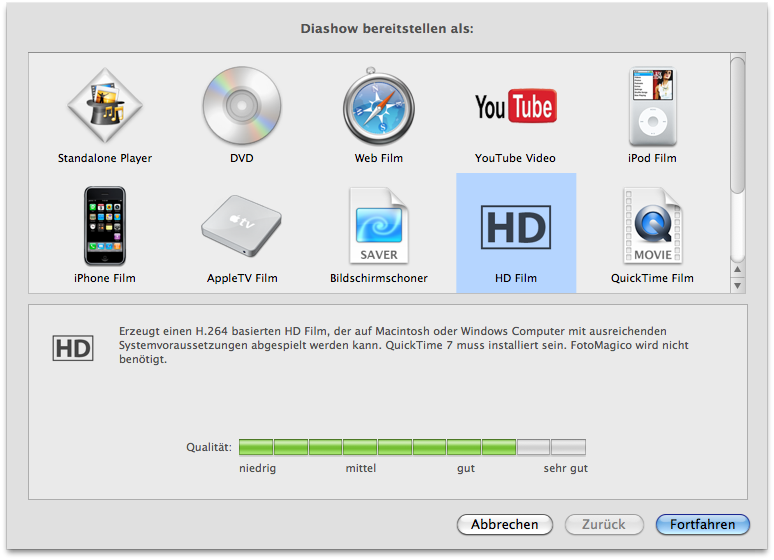 Wir haben einige Diashows mit FotoMagico erstellt und bescheinigen der Software eine einfache Bedienbarkeit: Wer seinen Mac bedienen kann, kommt auch auf Anhieb mit FotoMagico zurecht. Es ist keine längere Einarbeitungszeit nötig und man kommt sofort zu ansehnlichen Ergebnissen. Mit wenigen Mausklicks sucht man sich die gewünschten Fotos zusammen und hinterlegt diese mit passender Musik. Die Anzeigedauer jedes einzelnen Fotos sowie die Überblendeffekte lassen sich natürlich jederzeit anpassen. Grundsätzlich lässt sich, wenn gewünscht, eine Anfangs- und Endeinstellung eines jeden Fotos vornehmen, so dass die Diashow auf ein bestimmtes Detail des jeweiligen Fotos heranzoomt. Dadurch lassen sich Details betonen und man kann den Blick auf das Wesentliche lenken. Wem das Ergebnis gefällt, kann die fertige Diashow in vielen verschiedenen Formaten exportieren. So kann man einen Standalone Player erzeugen (eine .app Datei), welcher auch ohne FotoMagico läuft und alle Fotos sowie Musik der Diashow enthält, jedoch nur auf Apple-Computern abspielbar ist. Natürlich lässt sich auch eine Video-DVD erzeugen, die auf jedem herkömmlichen DVD-Player und auf Windows PCs abspielbar ist. Es gibt auch spezielle Profile für YouTube, iPod, iPhone, Apple TV, Mac OS X Bildschirmschoner, HD Movie, Web Movie und Quicktime Movie.