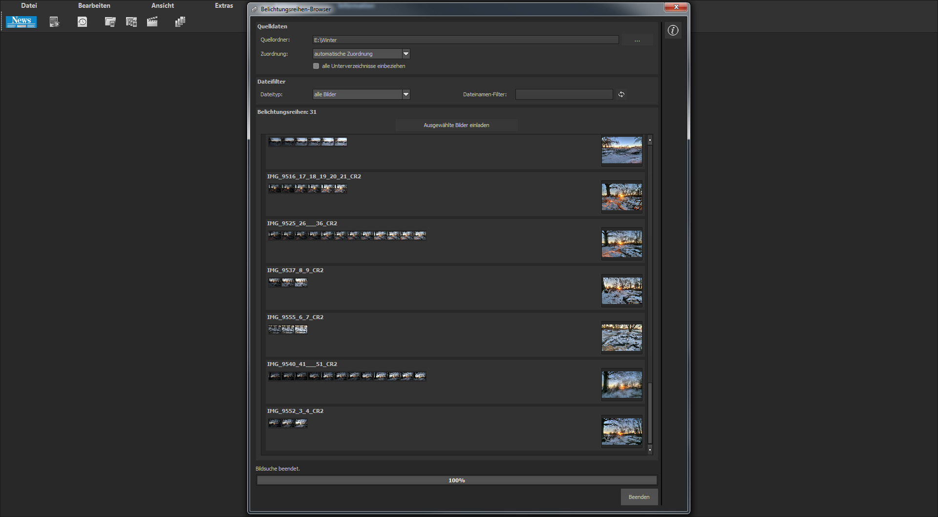 Im Belichtungsreihen-Browser werden aufgenommene Belichtungsreihen sortiert angeordnet: