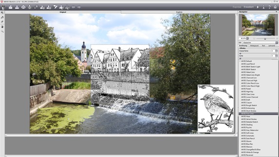 Die meisten Einstellungen befinden sich bei Franzis Sketch 17.0 in der rechten Werkzeugleiste. Hier befindet sich ganz oben der sogenannte Navigator. Dieser erlaubt die Wahl des Bildausschnittes. Darunter kann man sich für den Bearbeitungsstil entscheiden: Entweder klassisch oder künstlerisch. Ist diese Wahl getroffen, sollte man sich zunächst für ein Preset entscheiden. Diese Auswahl befindet sich am Ende der Werkzeugleiste. Da alle weiteren Optionen dazwischen liegen, hätte die Auswahl des Presets unserer Meinung nach unterhalb der Wahl des Stils mehr Sinn ergeben. Wirklich kritisch sehen wir diese Positionierung jedoch auch nicht. Generell findet man sich bei der Arbeitsoberfläche von Franzis Sketch 17.0 schnell zurecht.