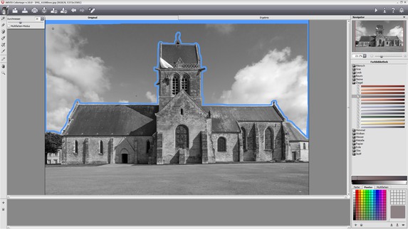 Nach dem Laden der zu bearbeitenden Schwarz-Weiß-Aufnahme sollte man sich zuerst entscheiden, welche Teile mit welchen Farben versehen werden sollen. Daraufhin sucht man die erste Farbe in der Farbpalette oder unter den Farbvorgaben heraus und umrandet alle Bildbereiche, die im fertigen Bild die gewünschte Farbe besitzen sollen. Da die Software wie erwähnt Kanten automatisch erkennt, müssen die Markierungen nicht 100 Prozent genau erfolgen. In unserem Test ließ sich das Ergebnis durch genaues Arbeiten aber in der Regel deutlich verbessern. Da das Zeichnen per Maus nicht besonders genau und ebenso nicht allzu komfortabel ist, bietet sich ein Grafiktablett für das Zeichnen der Markierungen an. Letzteres kann den durchaus längeren Arbeitseinsatz bei komplexeren Bildern zudem deutlich beschleunigen. Gut zu wissen: Als Unterstützung ist das Speichern der Markierungen für erneute oder spätere Bearbeitungen möglich.