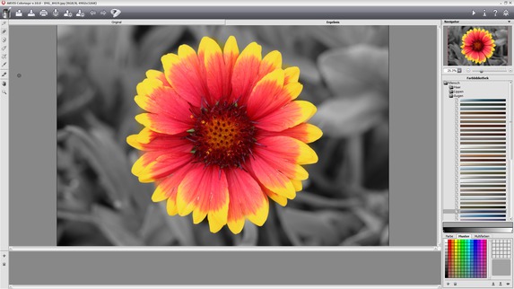 Um bei X Color effects professional 10 bzw. Akvis Coloriage V.10 einen Teil des Bildes in Schwarz-Weiß umzuwandeln, wird dieser Bereich mit dem Farberhaltungsstift markiert. Dieser signalisiert der Software, welcher Bereich nicht verändert werden soll. In unserem Beispielbild der Blume malen wir mit dem Farberhaltungsstift entlang der äußeren Blütenblätter. Im nächsten Schritt wählt man eine Graustufenfarbe aus und zeichnet eine Markierung außerhalb der Blütenblätter. Nach Vollendung des Vorgangs wird wieder die Pfeilschaltfläche zum Berechnen des Bildes betätigt. Beim fertigen Foto ist nur noch die Blume farbig. Wie bereits beim ersten Praxisbild gilt auch hier wieder: Die automatische Kantenerkennung arbeitet – vom Motiv abhängig – akzeptabel bis gut. Das genauere Markieren der Bereiche ist trotzdem unerlässlich, wenn das Ergebnis besonders hochwertig sein soll.