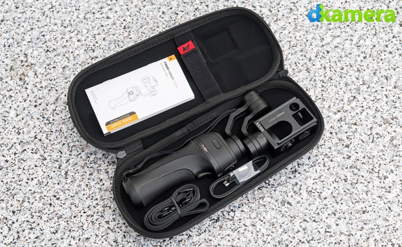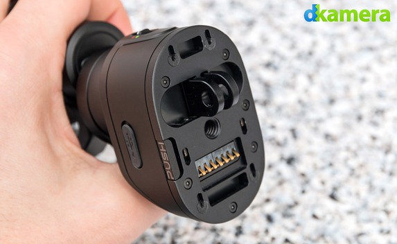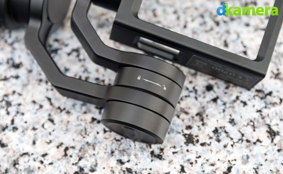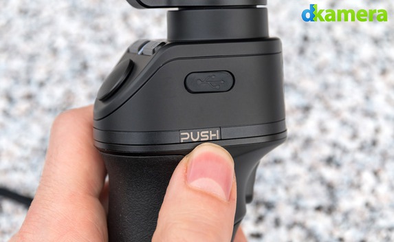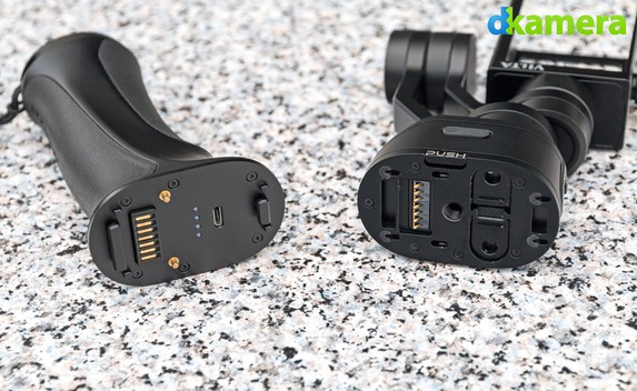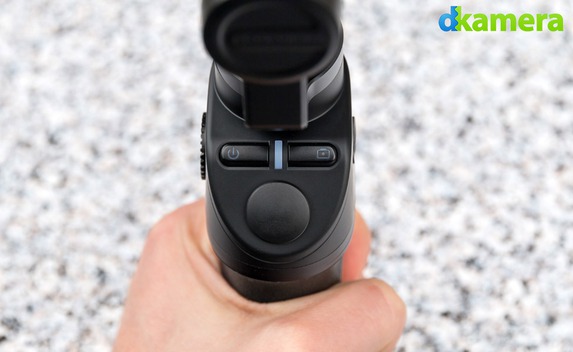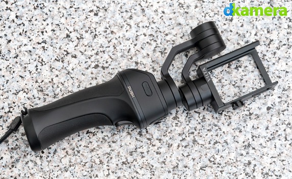 An einem Ende des Gimbal-Systems befindet sich ein Käfig zum Befestigen der Kamera, am anderen Ende wird das Gimbal-System mit dem Handgriff verbunden. Getrennt werden beide Teile durch das Drücken der Push-Taste, danach lässt sich der obere Teil (= Stabilisierungseinheit) leicht nach hinten ziehen und abheben. Die Stabilisierungseinheit verfügt über zwei Tasten: Eine dient zum Ein- und Ausschalten des Gimbals, mit der anderen lassen sich unter anderem Videos starten und stoppen. Die LED zwischen beiden Tasten gibt über den Status des Gimbals Auskunft.