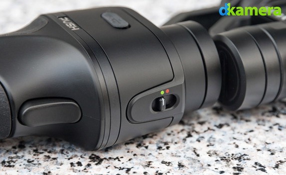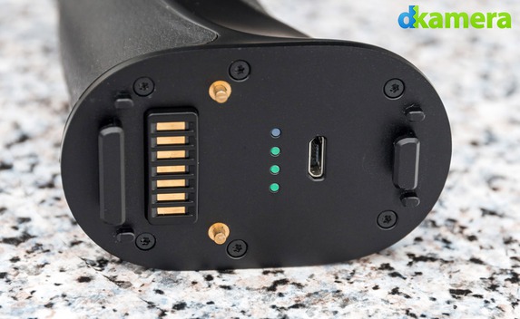 Auf der Oberseite des Griffs liegen ein USB-Port (Micro) zum Aufladen des Akkus sowie vier LEDs. Diese zeigen den Ladestand des Akkus an, wenn man auf den „Auslöser“ auf der Vorderseite drückt. Im Betrieb wird damit das Sperren der Stabilisierungs-Achsen realisiert. Das ist etwas schade, die Taste wäre schließlich zur Aufnahme von Fotos oder Videos prädestiniert. Das Sperren der Stabilisierungs-Achsen werden die meisten doch eher seltener verwenden.