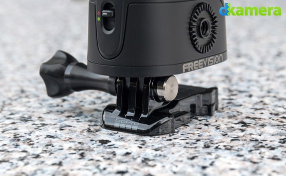 Wer die Stabilisierungseinheit vom Griff abgenommen hat, bekommt auf der Unterseite noch ein weiteres 1/4-Gewinde und eine Kontaktfläche mit Pins zu sehen. Letztere übernimmt die Datenübertragung und Stromversorgung vom Handgriff. Des Weiteren lassen sich aus der Basis noch zwei kleine Halterungen herausziehen. Diese ergeben ausgeklappt die von GoPro-Modellen bekannte Mount-Befestigung. Dadurch kann der Freevision Vilta an verschiedenem Zubehör befestigt werden.