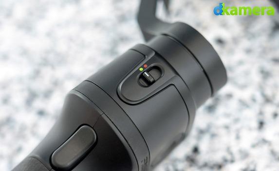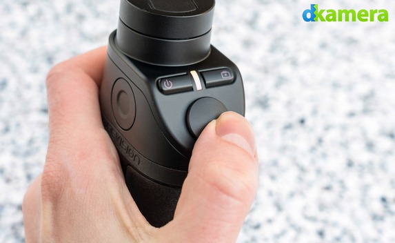 Dafür muss man die rechte der rückseitigen Tasten verwenden. Die linke Taste schaltet den Gimbal ein oder aus (drei Sekunden  drücken), zum kurzeitigen Deaktivieren (Sleepmodus) wird sie nur kurz gedrückt. Der „Joystick“ darunter erlaubt das manuelle Drehen der Motoren. Je nachdem wie stark der Joystick nach außen bewegt wird, ändert sich die Geschwindigkeit. Diese Bedienung fühlt sich zuerst etwas schwammig an, man kann sich daran jedoch gewöhnen. Zwischen den beiden gerade angesprochenen Tasten liegt eine LED, die den Betriebsstatuts des Gimbals signalisiert.