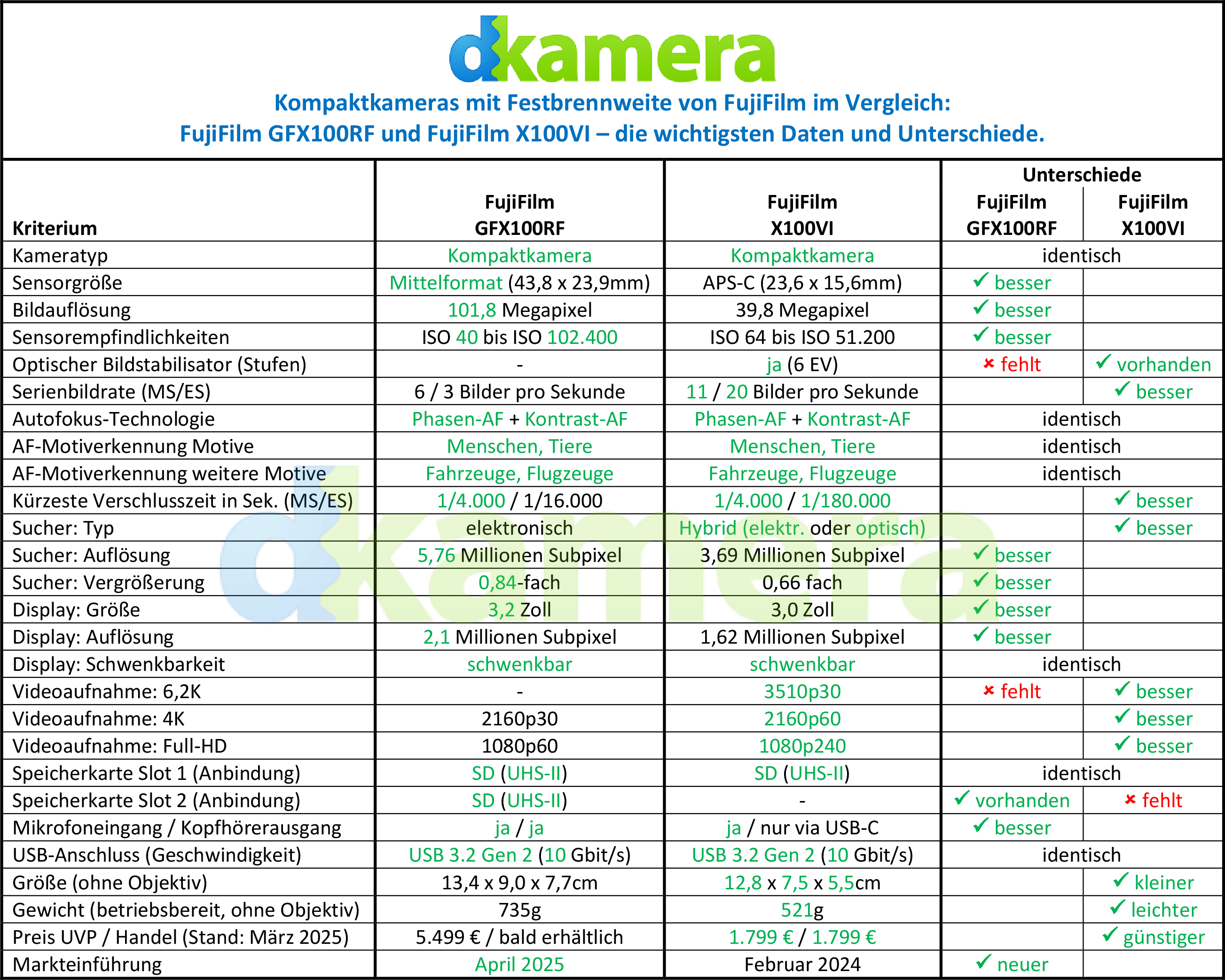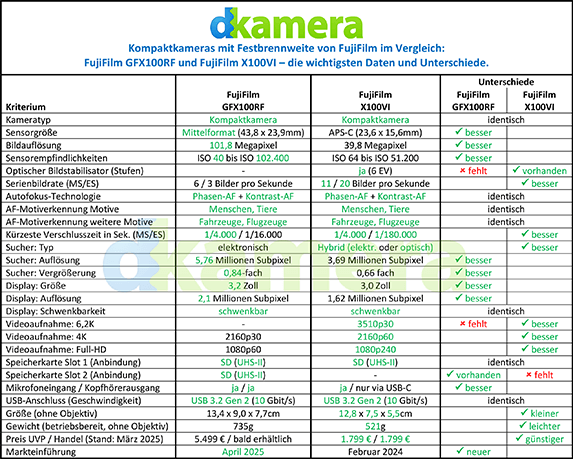Seit rund 15 Jahren bietet Fujifilm Kompaktkameras mit fest verbauten Objektiven und Bildwandlern in APS-C-Größe an. Die Kameras der X100-Serie erfreuen sich ungebrochener Beliebtheit und lassen sich mittlerweile in sechs Generationen erwerben. Nun ist Fujifilm noch einen Schritt weiter gegangen und hat mit der GFX100RF das erste Kompaktkameramodell mit Mittelformatsensor angekündigt. In diesem Vergleich schauen wir uns an, wie sich die GFX100RF und das aktuelle X100-Modell namens X100VI im Detail unterscheiden.