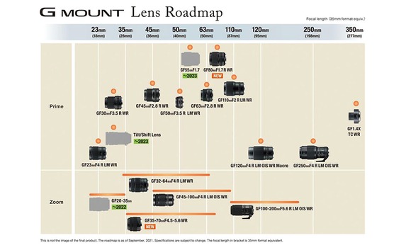 Für die GFX-Kameras mit Mittelformatsensor wird FujiFilm 2022 ein neues Objektiv vorstellen, das Jahr darauf sollen zwei neue Modelle erscheinen. Nächstes Jahr plant FujiFilm nach aktuellem Stand zunächst ein GF 20-35mm vorzustellen. Dabei wird es sich um ein Ultraweitwinkelzoom mit 16 bis 28mm KB-Brennweite handeln. 2023 wird ein GF 55mm F1,7 mit 44mm KB-Brennweite folgen, zudem arbeitet das Unternehmen noch an einem Tilt-Shift-Objektiv. Zu letzterem Modell sind noch keine genaueren Spezifikationen bekannt.