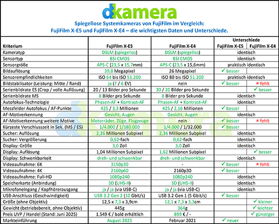 FujiFilm hat mit der X-E5 das Nachfolgemodell der schon länger erwarteten X-E4 vorgestellt. Diese kam vor mehr als vier Jahren auf den Markt. Bei der neuen Kamera wurde der Preis deutlich angehoben, die Leistungsdaten der DSLM sind jedoch teilweise auch wesentlich besser. Wir gehen im folgenden Vergleich detailliert auf die Unterschiede der beiden spiegellosen Systemkameras ein.