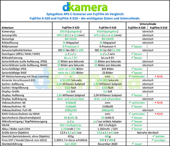 Während beide Kameras über den gleichen Sensor (X-Trans-CMOS-4-Sensor ) verfügen, hat sich FujiFilm bei der X-S20 für einen neuen Bildwandler entschieden. Statt dem X-Prozessor 4, der bei der X-S10 verwendet wird, kommt bei der X-S20 der neue X-Prozessor 5 zum Einsatz. Dieser sorgt laut FujiFilm für diverse Vorteile: Eine höhere Auflösung, eine bessere Rauschunterdrückung sowie die Unterstützung des HEIF-Formates. Letzteres lässt sich bei der X-S20 als Ergänzung zum JPEG-Format sowie RAW-Format nutzen. HEIF-Bilder bieten bei einer deutlich kleineren Dateigrößen einen größeren Dynamikumfang als klassische JPEG-Fotos und dadurch erweiterte Nachbearbeitungsmöglichkeiten.