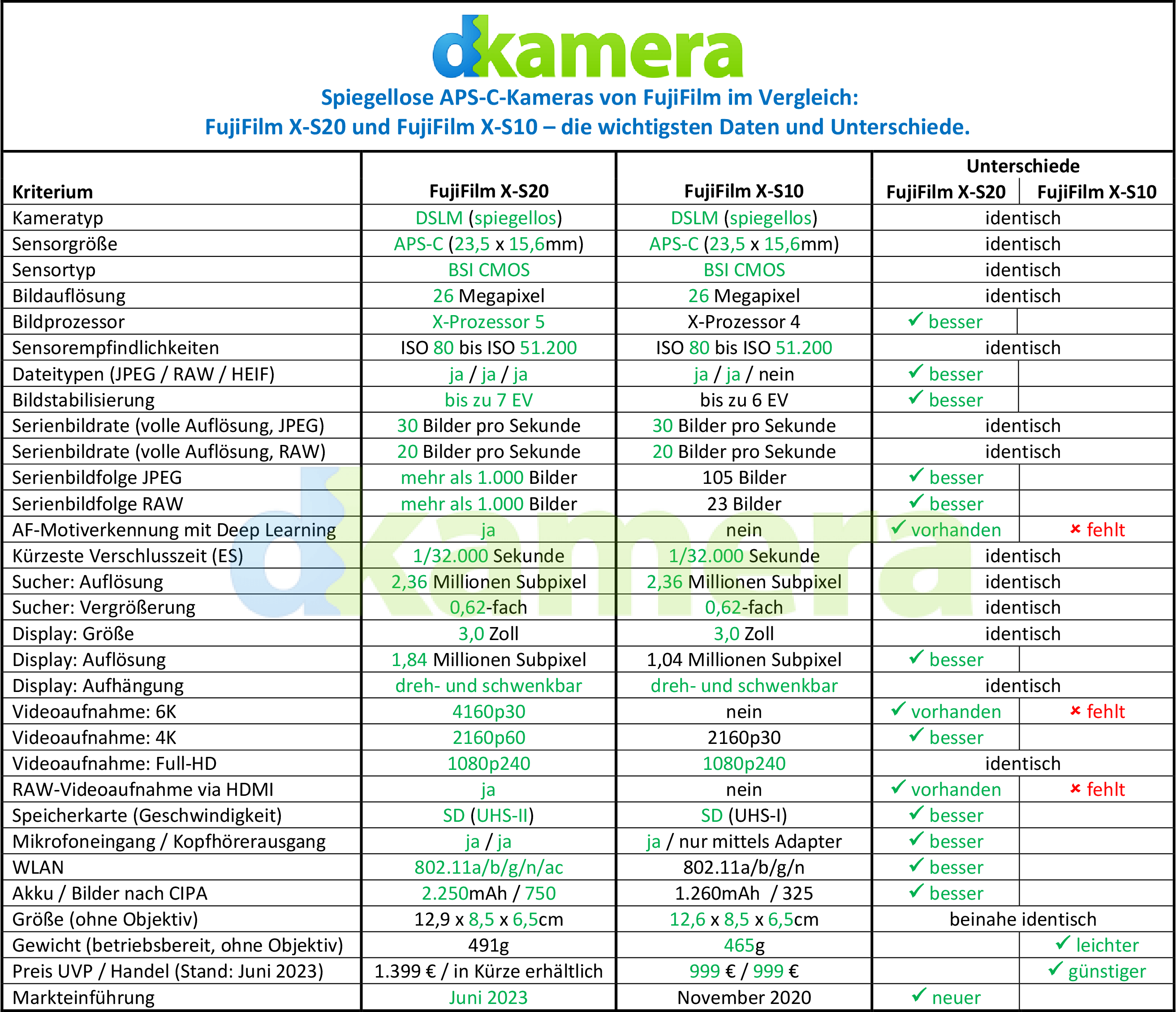 Mit der X-S20 hat FujiFilm eine neue Kamera der Mittelklasse vorgestellt. Die DSLM richtet sich wie ihr Vorgängermodell an Fotografen, die eine kompakte und leichte DSLM mit einer langen Featureliste suchen. Bei der neuen X-S20 hat FujiFilm neue Technik und einen größeren Akku verbaut. Wir vergleichen die DSLM mit ihrem Vorgängermodell X-S10.