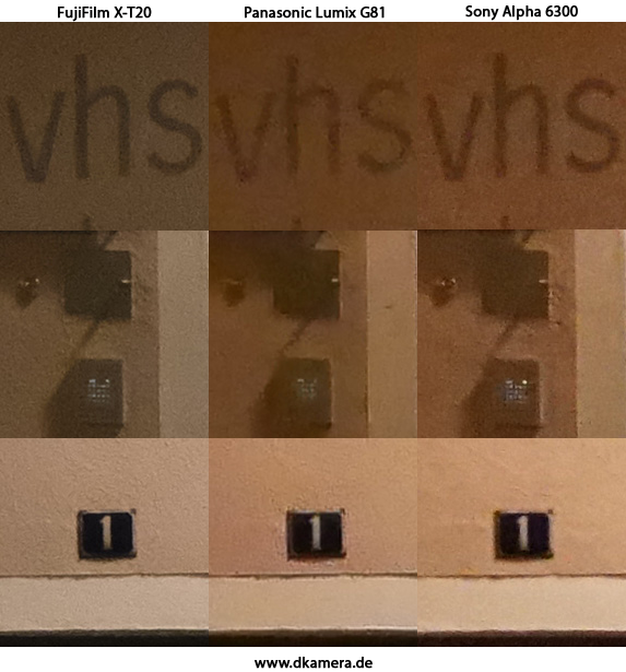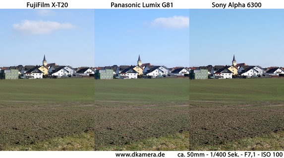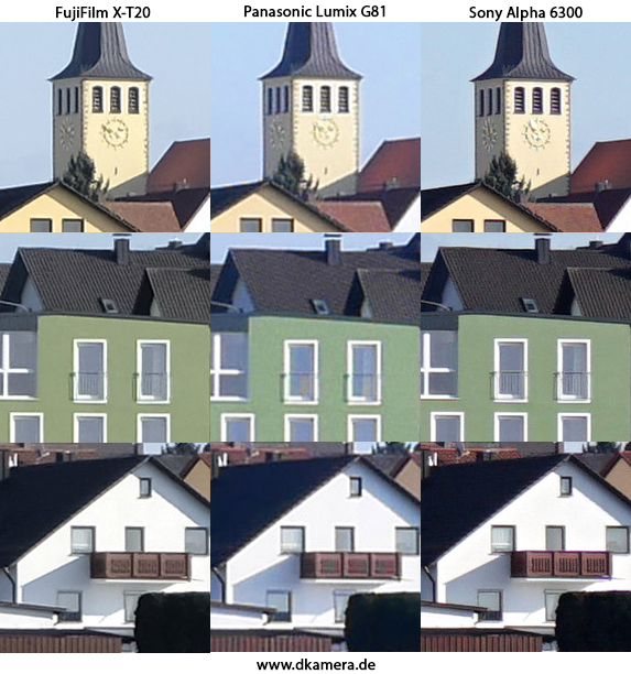 Im Praxisvergleich der Bilder sind die höheren Auflösungen der X-T20 und Alpha 6300 nicht zu übersehen. Die Aufnahmen beider Modelle sind bei Tag deutlich detailreicher, die G81 hält sichtbar nicht mit. Wer seine Bilder nicht stark zuschneiden möchte oder das Erstellen riesiger Ausdrucke vorhat, wird in vielen Situationen keinen größeren Unterschied merken.